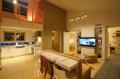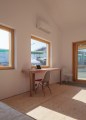 The welcoming look extends to the interior which is very homey and nicely arranged. Entry to the house is through a vestibule which helps keep cold air from entering. The main living area has a vaulted ceiling creating room for a loft over the kitchen. Next to the kitchen is the bathroom which also contains the laundry, saving some space. At the far end of the house is a combination bedroom and office with a folding wall to divide the space when needed. With two separate entrances already in place, a permanent wall could be easily added if the occupants needed to have two bedrooms.