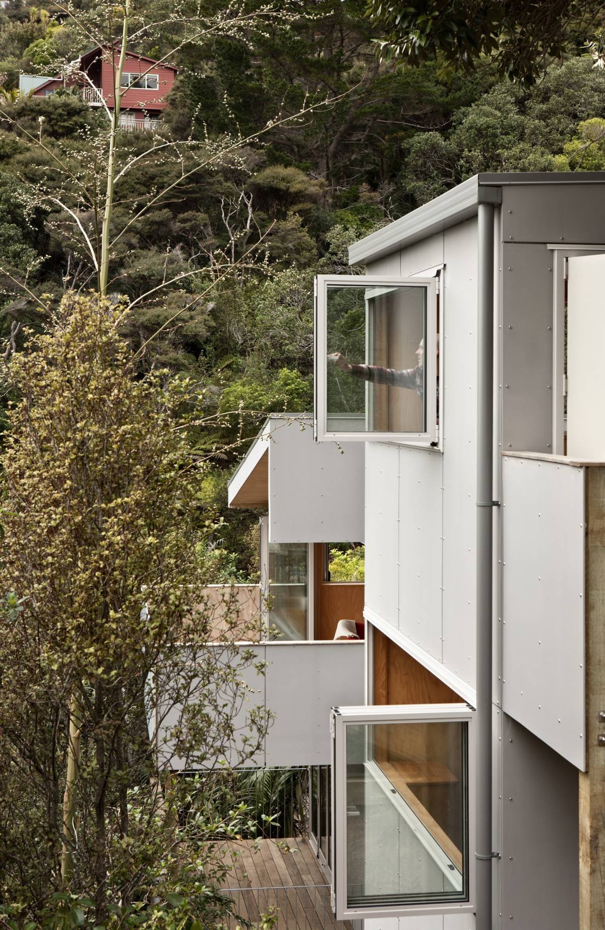 To get around this small hillside house, the owners must step outside; external decks and stairs serve as circulation space. The house has 3 bedrooms in 1,076 sq ft. | www.facebook.com/SmallHouseBliss